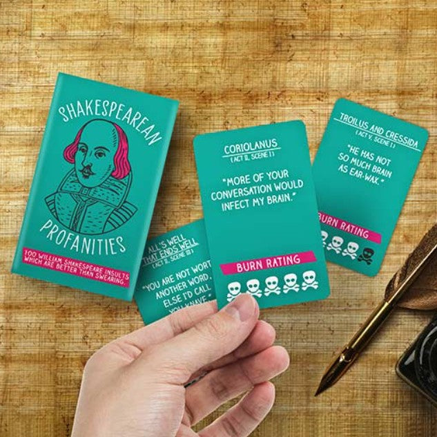 Discover the art of the insult with Shakespearean Profanities, a set of 100 cards featuring the Bard’s most biting and clever jabs. Perfect for literature lovers, wordsmiths, or anyone looking to elevate their vocabulary of comebacks, this set adds a dash of wit to your repertoire.