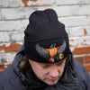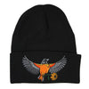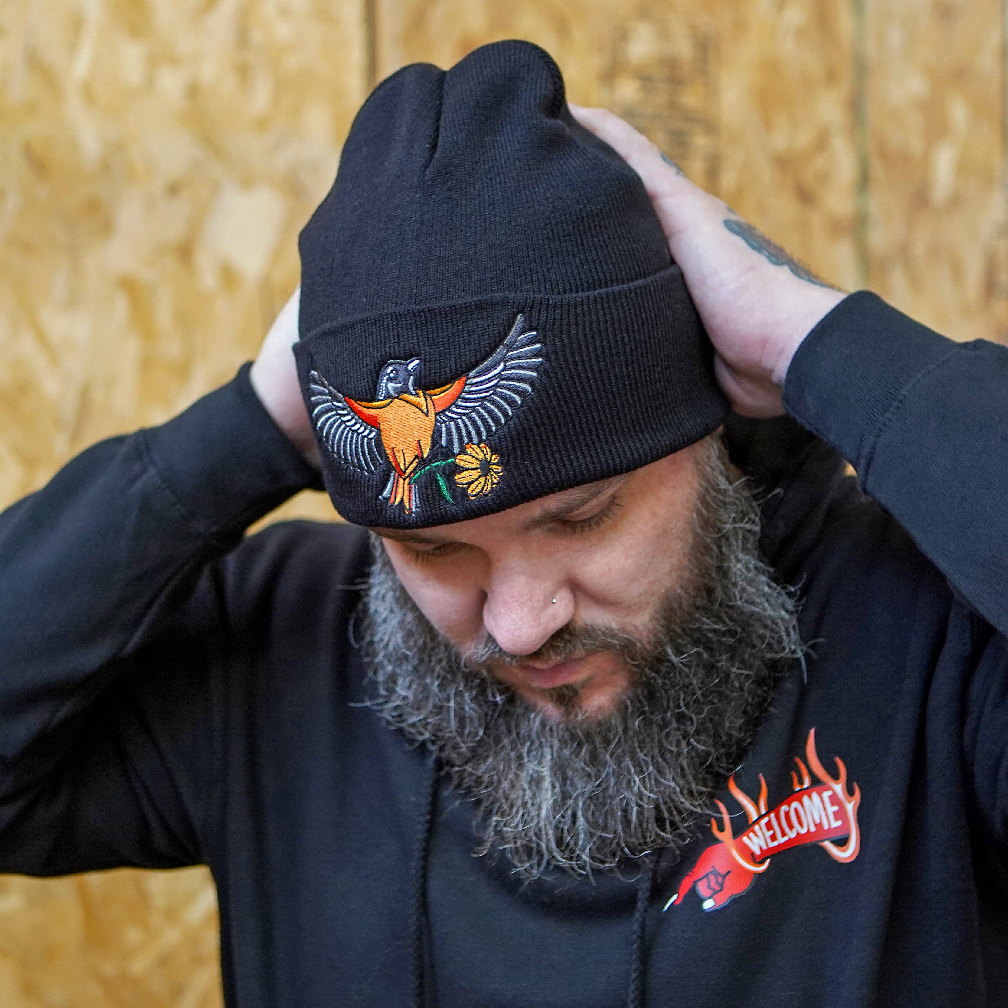 Our oriole design is now available for the winter crowd, black knit beanies. A traditional tattoo-style oriole is embroidered on our knit beanie.