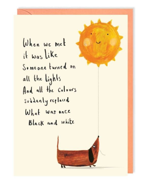 A card for the one who changed everything. This 4" x 6" card features a sweet illustration of a dog holding a sunshine-shaped balloon, paired with the sentimental message: