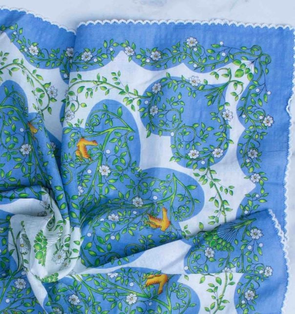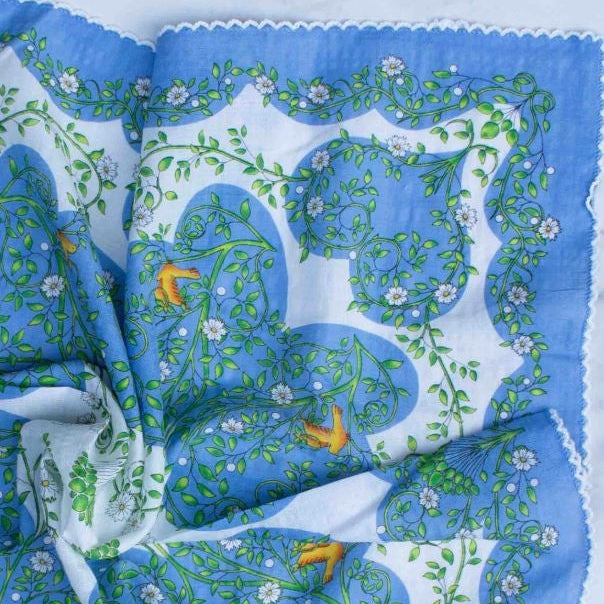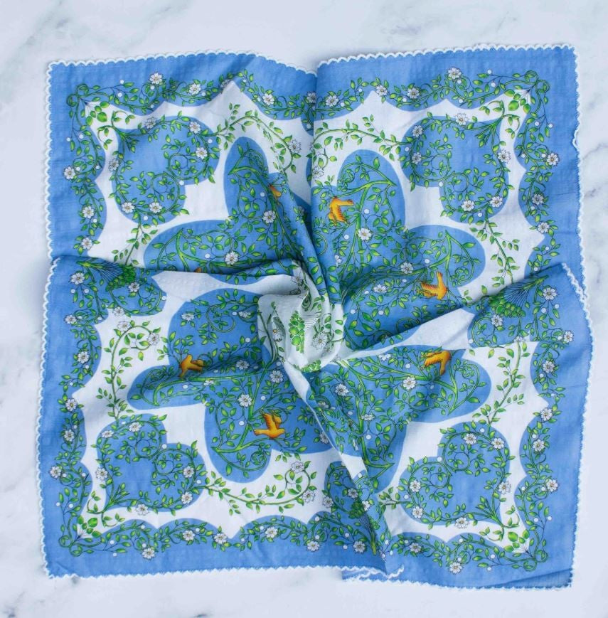 Bird & Vine Cotton Rayon Scarf – 21"x21" (55x55cm) Elevate your style with our beautifully patterned scarf featuring delicate vines, tiny blossoms, and golden birds. Available in three stunning colors – Navy, Sky Blue, and Wine Red – this versatile piece is crafted from a soft cotton-rayon blend, offering both breathability and a smooth drape. Perfect as a neck scarf, headband, or bag accessory, this square scarf brings a touch of nature-inspired elegance to any look. Its lightweight fabric makes it ideal for all-season styling. Material: Cotton + Rayon Size: 21” x 21” (55cm x 55cm) Design: Floral vines & bird motif with scalloped border