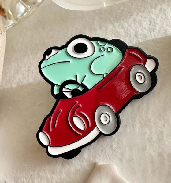 Who gave this frog a license!?- 25x35mm.- Lapel pin.- Nickel and lead free.