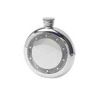 This round flask features an elegant engraved Celtic frame pattern and holds up to 6 ounces of liquid.