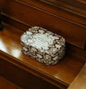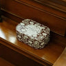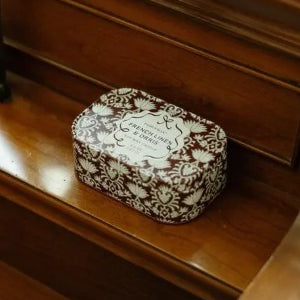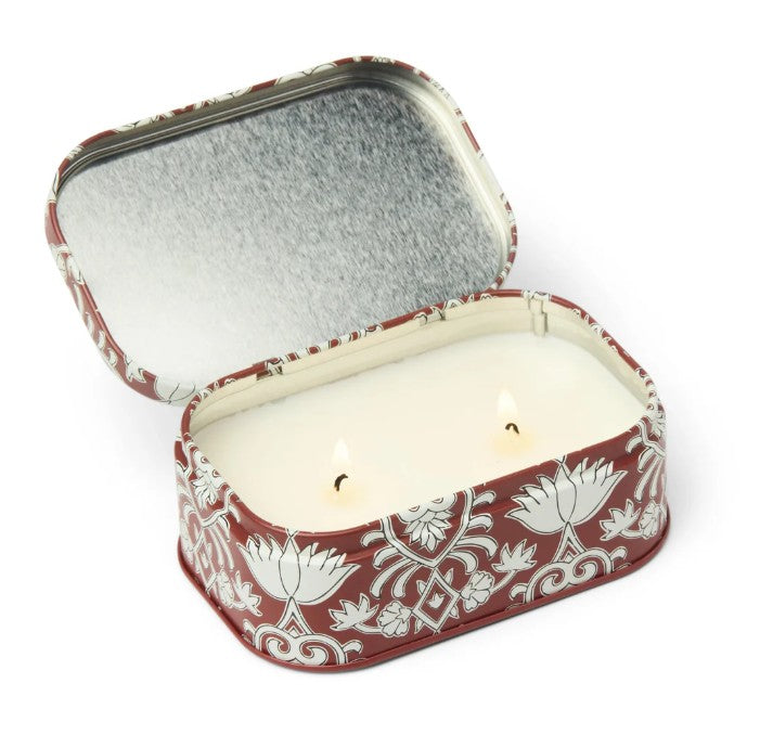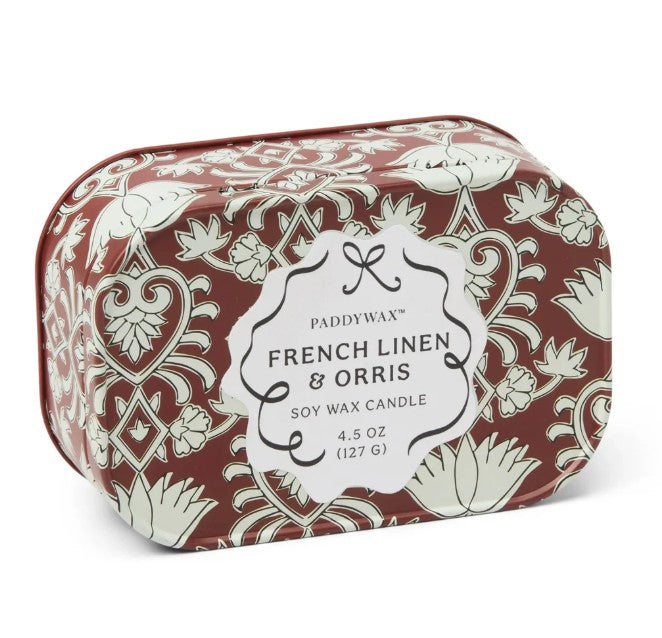 The French Linen & Orris Chérie 4.5 oz Tin Candle comes in a patterned tin with a hinged lid, two wicks, and a removable label. Fragrance notes include bergamot, eucalyptus, French lavender, salted fig, tonka bean, and sea-soaked woods. After burning, the tin repurposes easily as a trinket or jewelry holder.