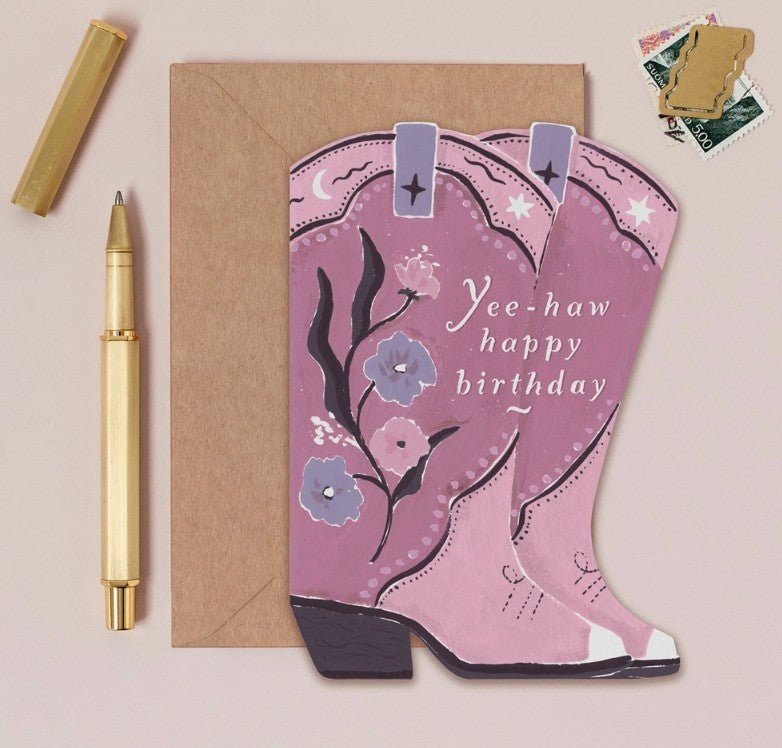Yee-haw! This cowboy boots birthday card is cut into the shape of a stunning pink pair of cowgirl boots, complete with hand-painted floral details and ‘yee-haw happy birthday’ caption. The unique western theme shape of the birthday card makes it an unforgettable gift, and the blank inside is ready for a personal message.