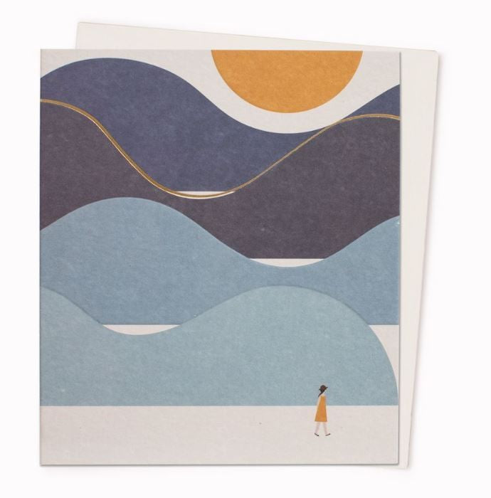 A serene, artistic blank card measuring 5 x 5.5 inches. The front showcases a stylized sun rising over gently rolling hills. Ideal for any occasion, the design evokes warmth, calm, and natural beauty. Inside is left blank for a personalized message.