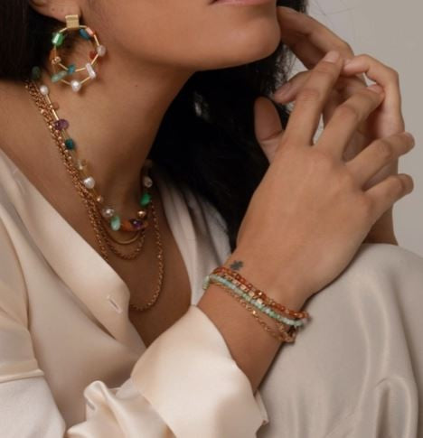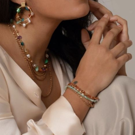 Oso Bracelet is perfect for brightening up any Spring wardrobe. Designed with new and exciting colours for the season, the bracelet is made with Apatite hand-cut gemstones. Layer them together for a fun multicolour look. Length: 7" with 1" extender chain Recycled, vintage brass Artisan-cut natural gemstones Handmade in Vancouver BC