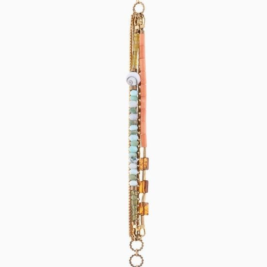 The Belinay Bracelet showcases a striking mix of shiva shell, dyed coral, hand-cut gemstones, and brass accents. Its multiple strands feature a diverse range of colours, including Blue Peruvian Opal, Hessonite, Peridot, Yellow Jade, Dyed Coral, and Shiva Shell. This multi-strand statement bracelet is guaranteed to capture attention. Length: 7" with 1" extender chain Recycled fair-trade brass Artisan-cut natural gemstones Dyed Coral Shiva Shell Handmade in Okanagan BC