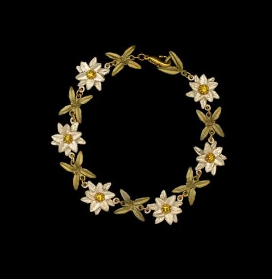 Embrace the delicate beauty of the alpine edelweiss flower with the Edelweiss Bracelet by Michael Michaud. Cast in bronze with a hand-applied patina finish, this exquisite bracelet features intricate details that capture the natural elegance of the flower’s petals. Accented with 22k white gold leaf, each petal gleams with a soft, sophisticated shine, while the Austrian crystal center, set in 24k gold, adds a brilliant touch of sparkle.
