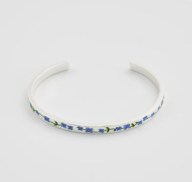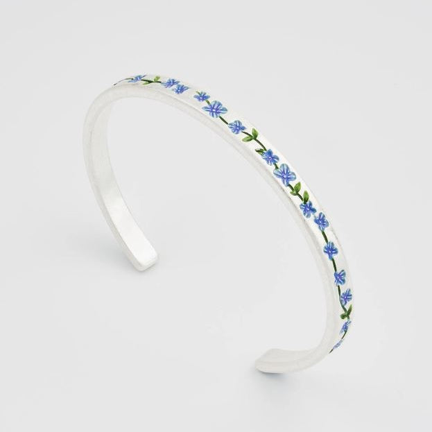 Whispers of summer bloom softly in the Agnes Forget-Me-Not Bangle, where delicate wildflowers are frozen in time across a graceful silver arc. Inspired by hedgerow petals and moments never to be forgotten, this elegant bangle captures the essence of love, memory, and renewal, echoing the poetic stillness of long, golden evenings. Crafted in worn sterling silver-plated brass with intricate enamel detailing, this bangle showcases clusters of forget-me-not flowers in vivid blue, accented with soft green leaves. The open-ended design makes it easy to slip on and wear, offering a comfortable yet refined fit for daily wear or special occasions alike. Key features: * Category: Jewellery - Bangle * Materials: Worn sterling silver-plated brass, zinc alloy, enamel * Dimensions: 60mm x 50mm inner diameter; 30mm opening; 4mm width * Care: Wipe clean with a soft cloth; avoid contact with moisture and chemicals