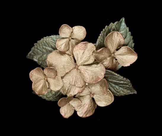 Materials: The Hydrangea brooch is cast in bronze with hand patinated leaves and flowers featuring an antique bronze over copper finish.