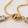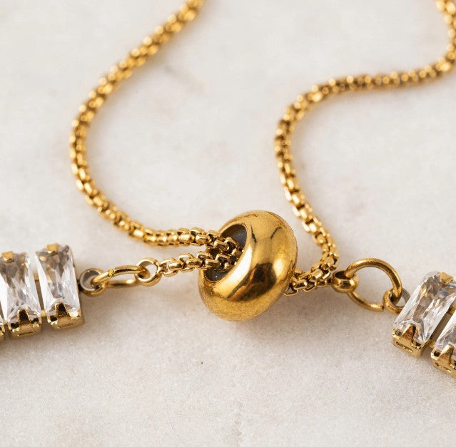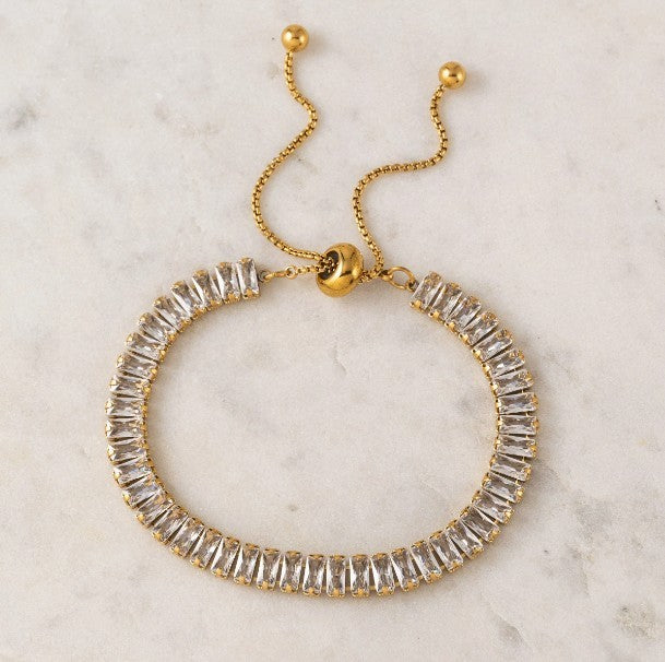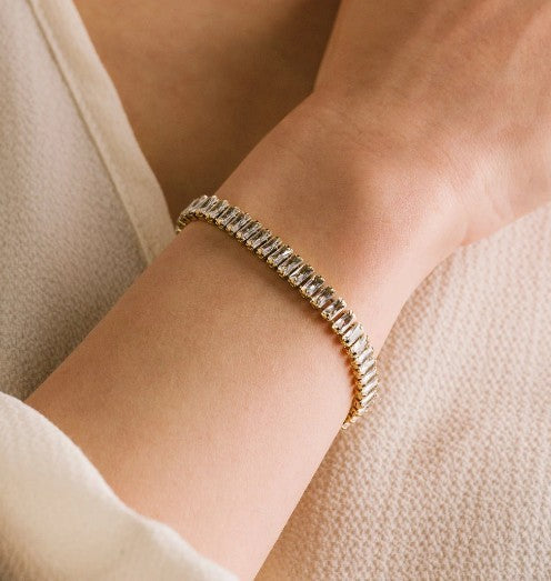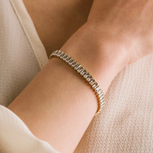 A string of baguette-shaped crystals form a beacon of light across your wrist. Made with PVD and stainless steel, you can wear this waterproof bracelet anywhere.