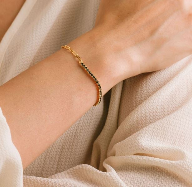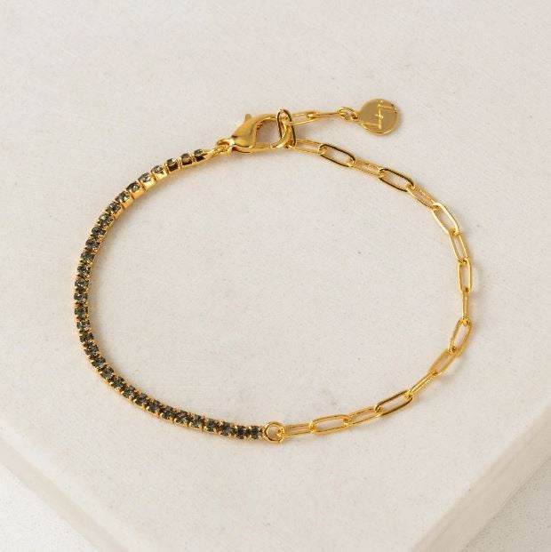 A fresh take on the classic tennis bracelet. Paperclip and glass crystal chains merge to create an exquisite statement piece.