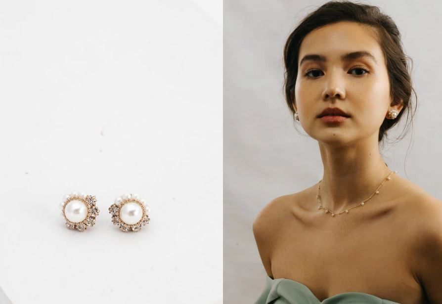 A classic and feminine silhouette, the Empress Pearl Earrings are circled by golden beads set with small pearls and sparkly stones. A difference that adds texture to the otherwise classic design.