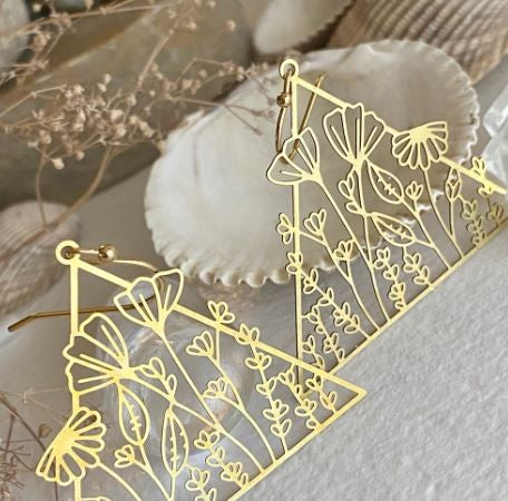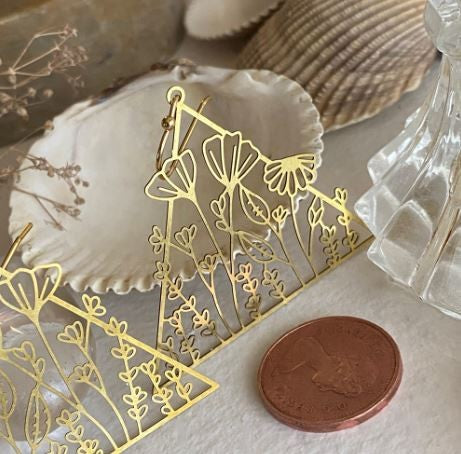 This raw brass triangle has a beautiful flower motif, blending the hard metal and soft flowers so effortlessly. The triangles hang form our gold plated shepards hooks.