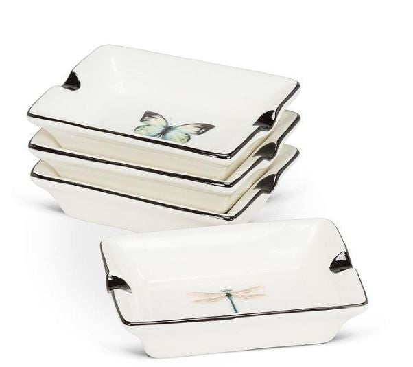 You don't have to be an entomologist to appreciate the unique charms of these Insect Small Rectangular Dishes. Available in four assorted styles featuring a bumblebee, butterfly, dragonfly and ladybug respectively, these elegant rectangular white dishes and accented with a black rim — versatile enough to use as serving vessels, pin dishes or even ashtrays, depending on the crowd or the occasion!