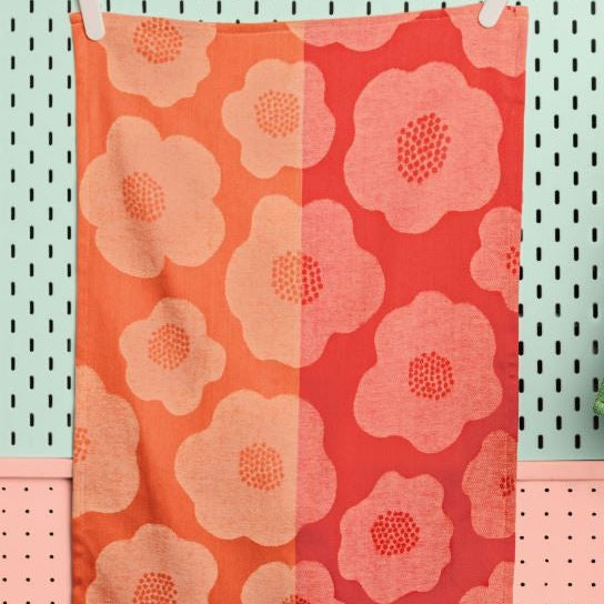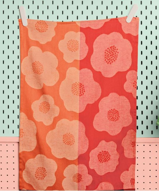 Durability meets joyful design in this Poppy jacquard dishtowel with fun-forward colors and patterns. Flush with vibrant reds and petal pinks this pattern of amplified florals is an invitation to pause and appreciate the bold beauty of the Poppy.