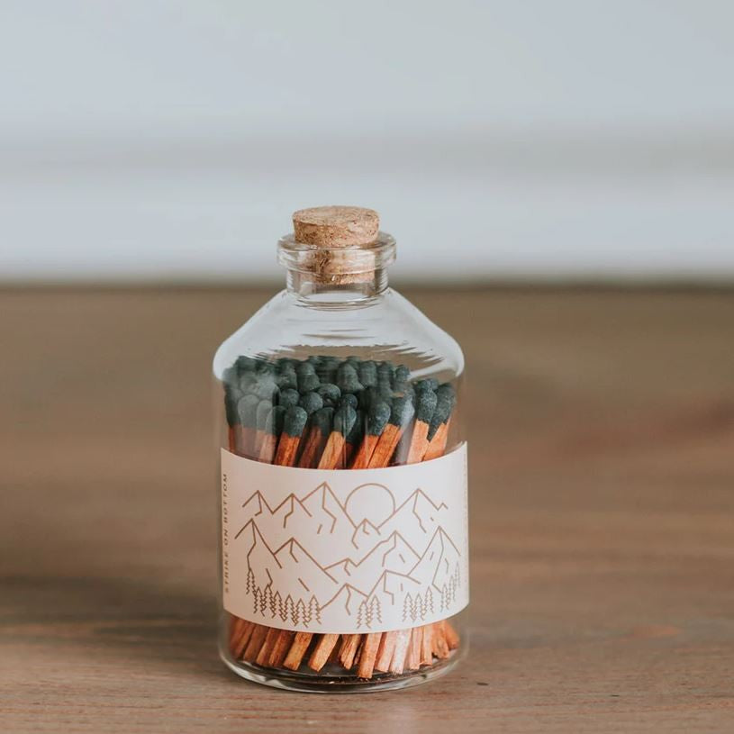 Glass jar and hand-drawn, beautifully designed label crafted to bring ambiance to any occasion. Each apothecary jar contains 75 aspen wood matches, with strike paper affixed to the bottom of the jar for easy lighting.