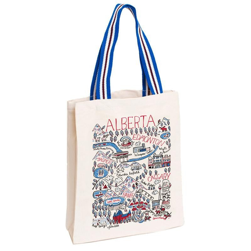 Alberta Cityscape art printed on large tote bag with side & bottom gusset. Fairtrade-made 100% cotton tote with tri-color webbing handle. Hand illustration of Alberta landmarks, Screen print in Canada. Size: 15w x 17h x 4d