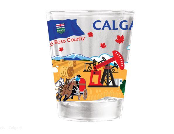 The perfect souvenir from Calgary. A shot glassic featuring key landmarks of the city of Calgary architecture including the skyline, the Calgary Tower, and the saddledome. The glass also features the iconic Rocky Mountains, the Prairies, and the World Famous Calgary Stampede.