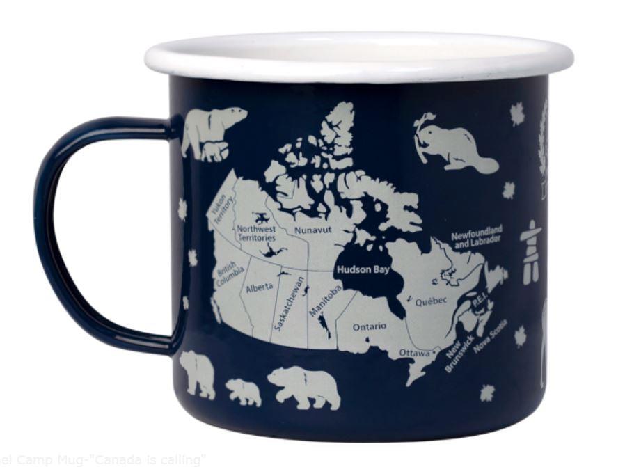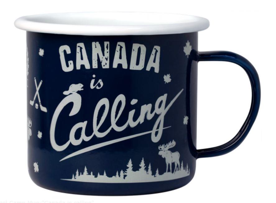 The enamel mug is perfect for camping or enjoying a beverage in your backyard. The mug hold 18 ounces of your favorite hot or cold beverage. Featuring the words "Canada is Calling"