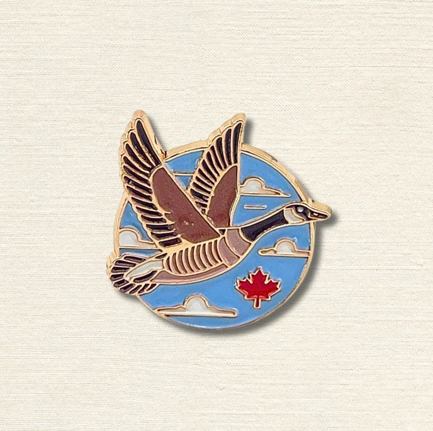This enamel pin captures the elegance of the Canada goose in mid-flight, set against a blue sky dotted with soft clouds and a symbolic red maple leaf. The graceful pose and upward motion reflect freedom, endurance, and the spirit of Canadian wilderness. It's a refined and meaningful design that resonates with nature lovers and proud Canadians alike.