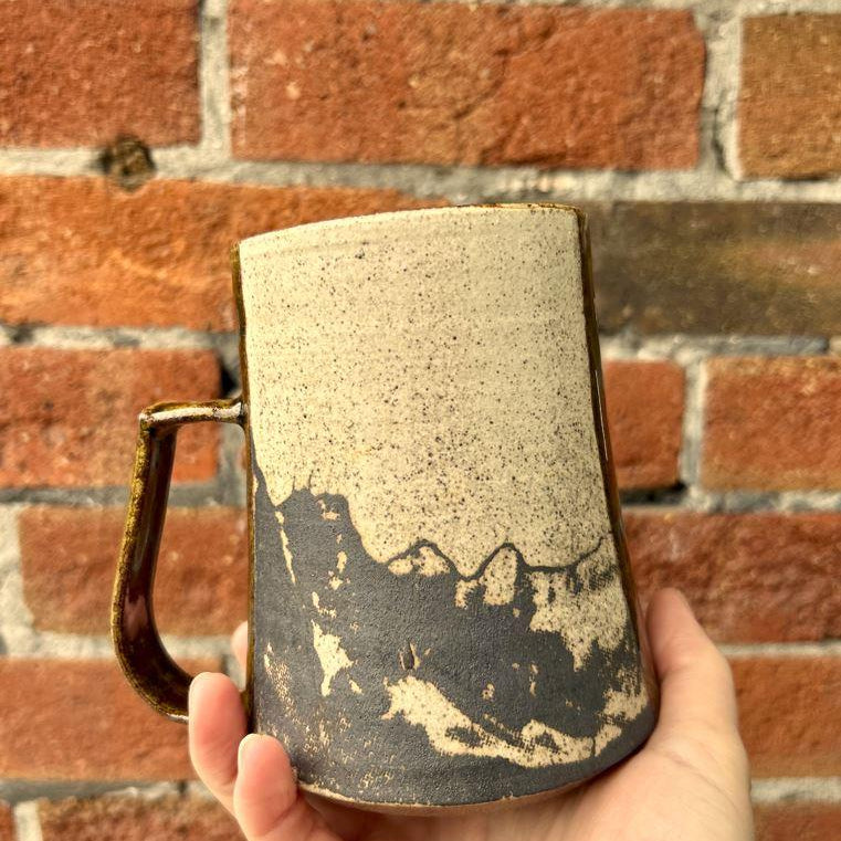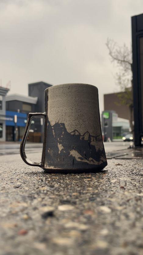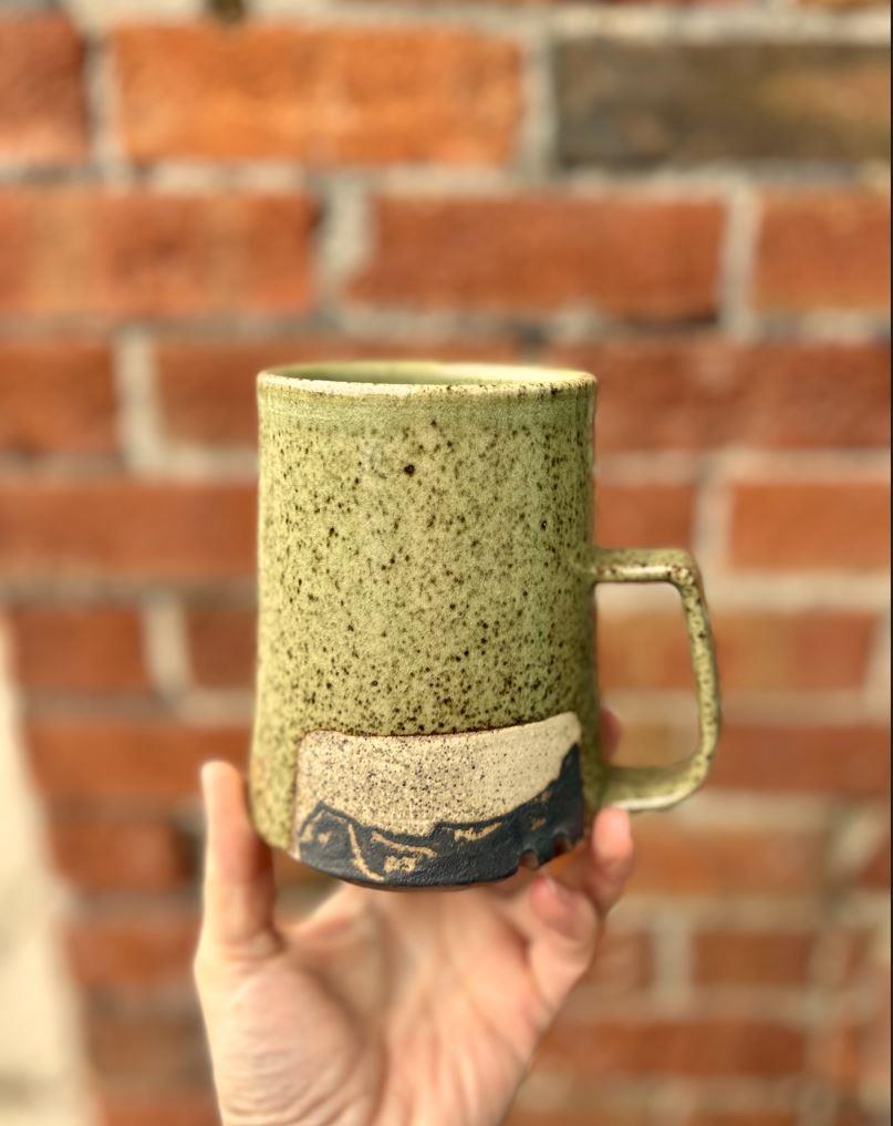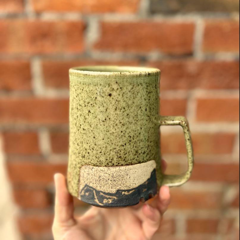 Gorgeous handmade pottery. This locally made mug features gorgeous mountains, perfectly capturing Alberta's scenic landscape. Gorgeous handmade kitchenware made locally. Each has a distinct earthy toned glaze with hues or green, brown, and blues. No two are alike.
