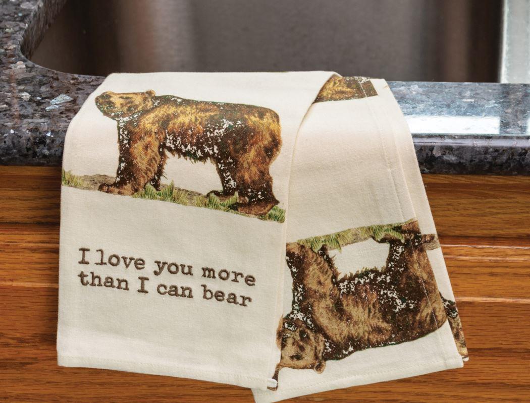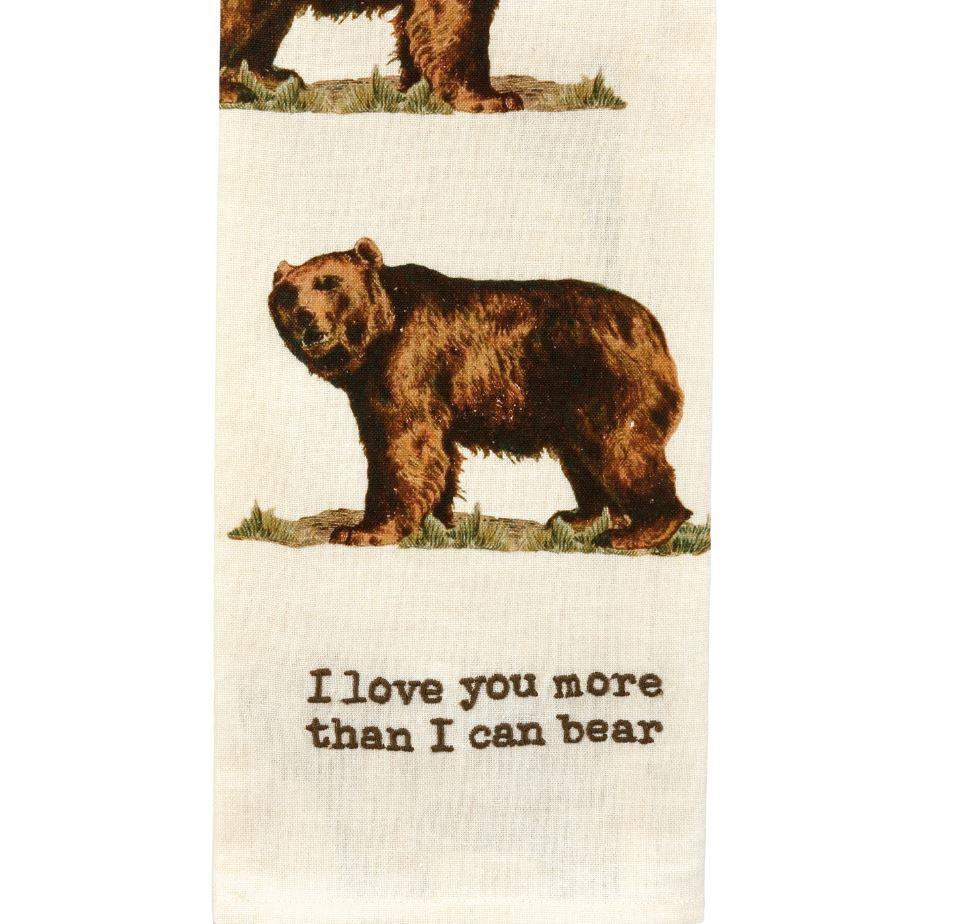 A cotton linen blend kitchen towel featuring all-over vintage bear designs and punny embroidered "I Love You More Than I Can Bear" sentiment. Our I Love You More Than I Can Bear kitchen towel is machine-washable.