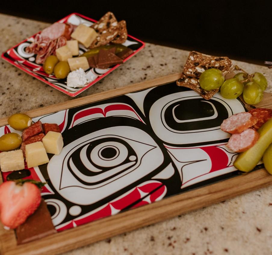 Made from durable and resistant Acacia hardwood, Native Northwest Serving Boards feature a removable glass insert (12" x 7.25") that displays a gorgeous food-safe ink Indigenous design printed on its back. Perfect for any occasion and conveniently individually boxed for easy gift-giving.