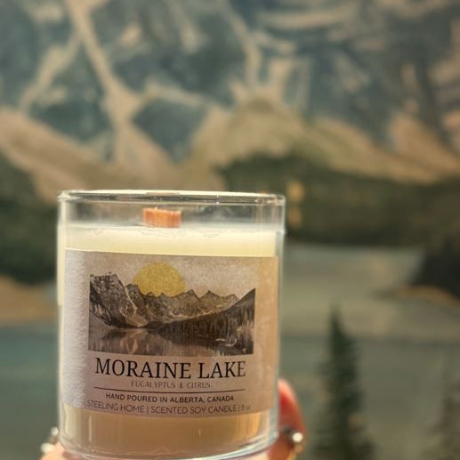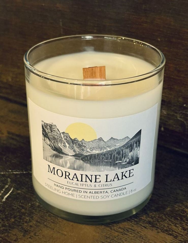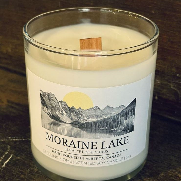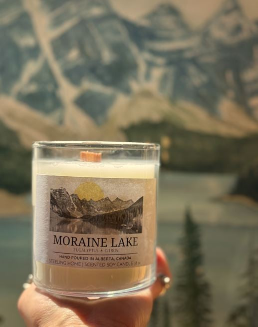 A Steeling Home Exclusive. Our Moraine Lake Candle has a refreshing and light aroma of eucalyptus, lemongrass, and citrus. A light but juicy scent to enliven your home amd help you unwind.