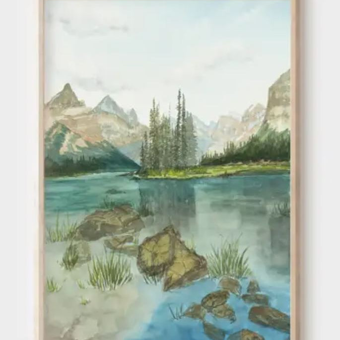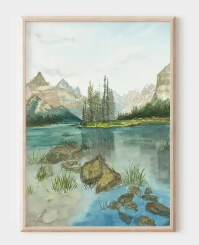 This painting reflects the feeling of being completely surrounded in nature, without another person in sight. Soaring rocky peaks, bright blue mineral glacier lakes, and the freedom to wonder. Spirit Island holds its own special magic. Reproduced on beautiful, thick cotton watercolour paper, this giclee print looks and feels just like an original watercolour painting. Each print comes varnished with a wide border.