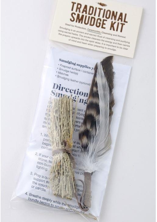 Traditional Smudge Kit. Contains a small smudging feather fan and small sage bundle. Individually packaged and comes with smudging directions.