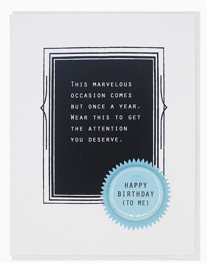 Congratulate birthday person with this clever card. Features a 1¼” button that can be taken off and proudly worn by the recipient.