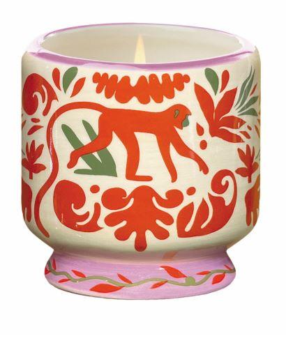 Bring the wild indoors with this vibrant 8 oz handpainted ceramic candle, featuring a bold red monkey nestled among lush red and green jungle leaves. Each candle is a unique work of art, painted by hand with striking color and detail. The scent is a warm, tropical blend of coconut and amber, creating an inviting, exotic atmosphere in any room.