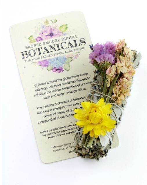 Botanical Smudge in small Sage with Lavender and Strawflower. Each bundle is accompanied with a plantable paper embedded with wildflower seeds, smudging directions and comes packed in a colored organza pouch. Due to being a natural, wildly grown herb, our California white sage and cedar bundle sizes will vary and are approximate 3.5" to 5"