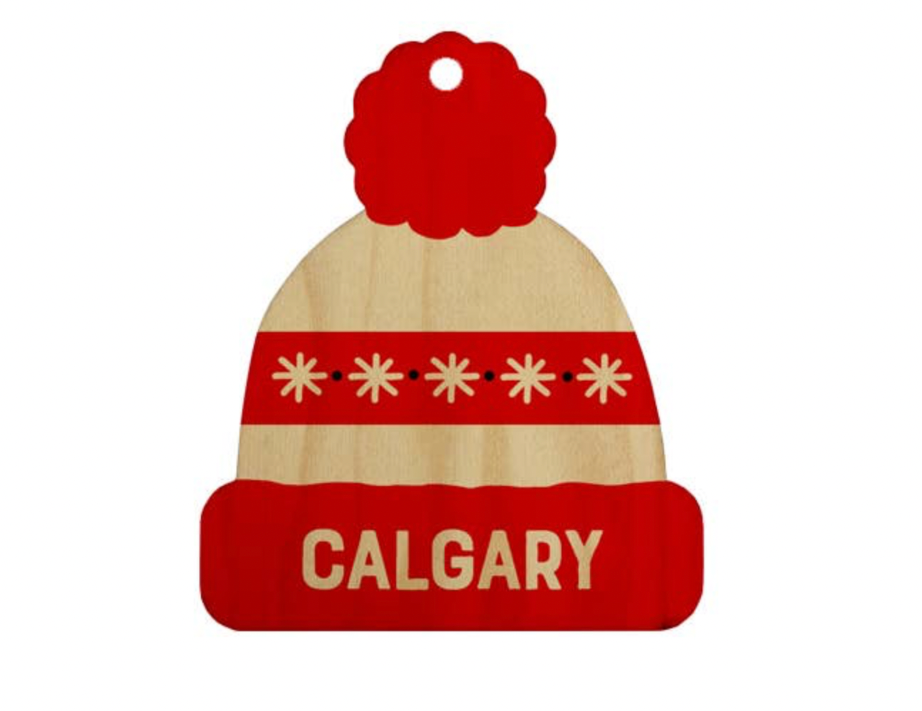 • 3" maple die-cut wood ornament in the shape of a beanie ski hat • Black and White Striped Grosgrain Ribbon