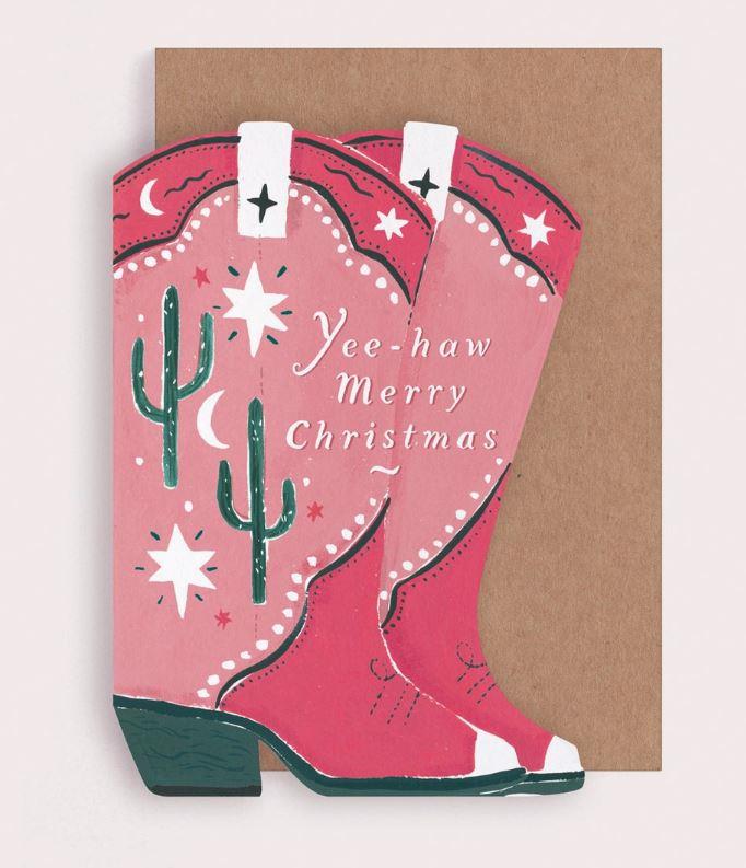 Get rowdy this Christmas with a sprinkle of western vibes from this Cowboy Boots Christmas card. The unique holiday card is cut into the shape of a stunning pair of red cowboy boots with a pattern of cacti, stars and moons and a “Yee-haw Merry Christmas caption”. The holiday cards are a modern gift for those who love a twist on tradition.