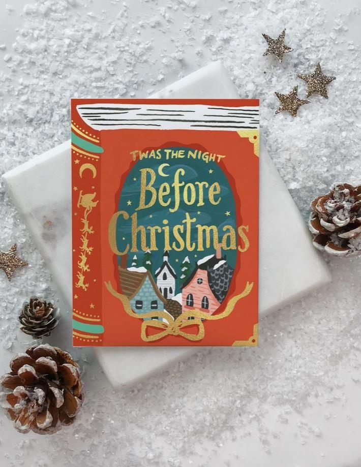 A festive night before christmas book themed card to spread happy holiday wishes.