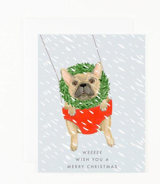 A hand painted frenchie wearing a wreath in a swing with snow text reads "Weeeee Wish You a Merry Christmas"