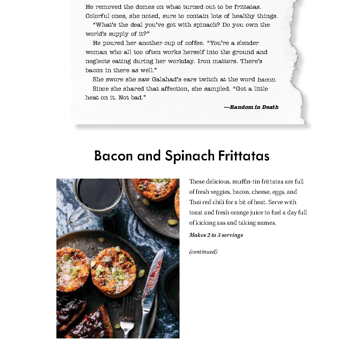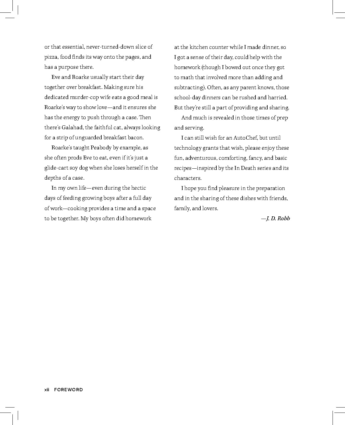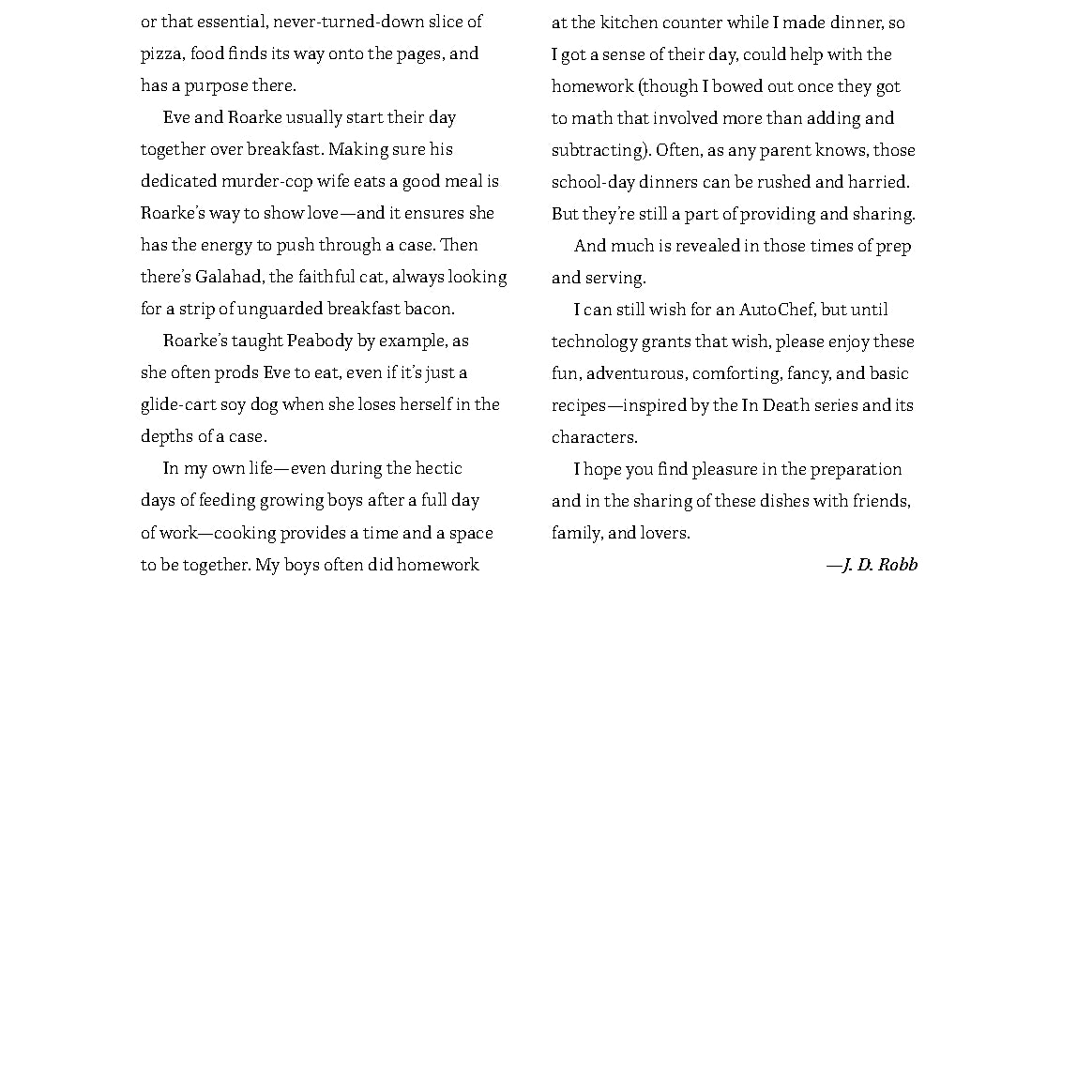 With more than seventy amazing photographs, and story excerpts that connect the recipes to the novels that inspired them, The In Death Cookbook will transport fans from the bustling streets of futuristic New York City to Lieutenant Eve Dallas and Roarke's luxurious Manhattan mansion, where they'll learn to prepare the most delectable dishes. From Autochef favorites to Summerset's mouth-watering desserts, readers will find professionally developed, easy-to-prepare selections ranging from breakfast entrees to sides, main courses and everything in between. Contributions from the whole In Death cast of characters, including the belovedsnack - Feeney's Candied Nuts!
