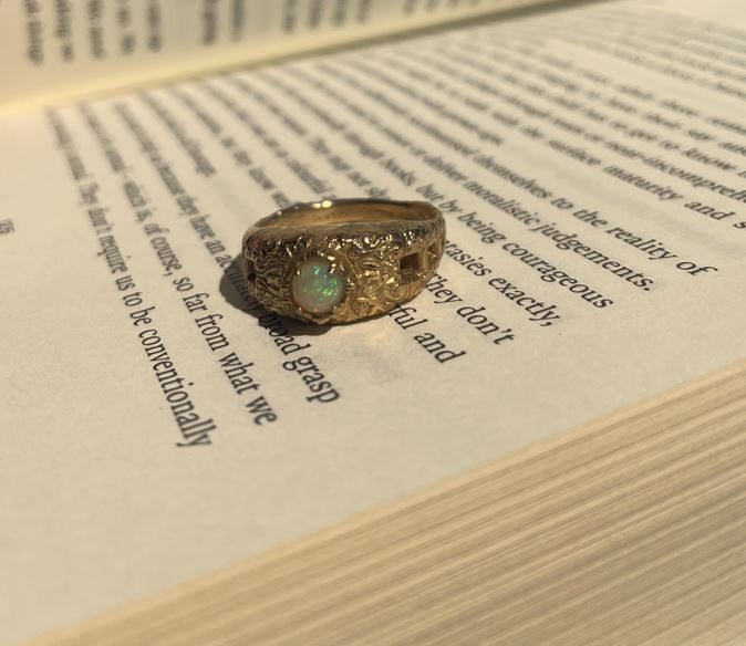 This ornately detailed ring features intricate carved patterns inspired by ancient Roman art, adding a touch of timeless elegance. At the center of the ring, a breathtaking large gemstone, carefully set in a bezel, captures the light and radiates a mesmerizing brilliance.