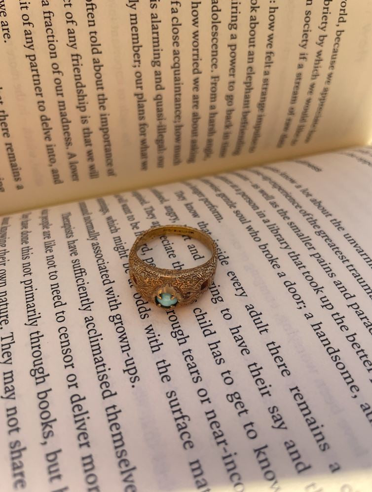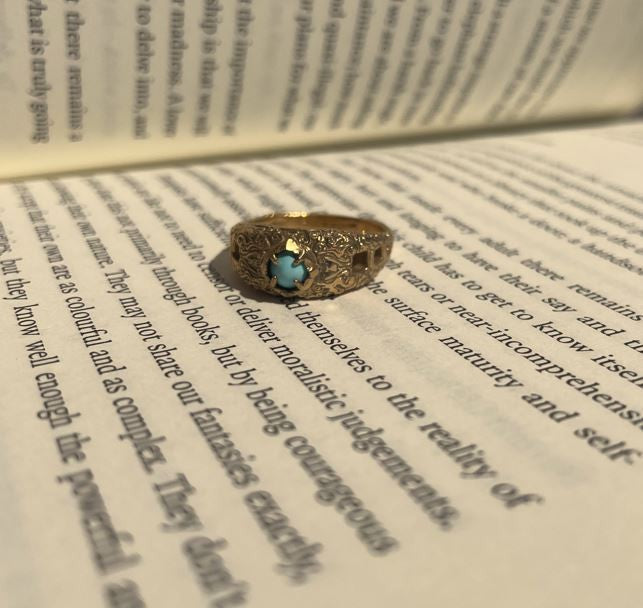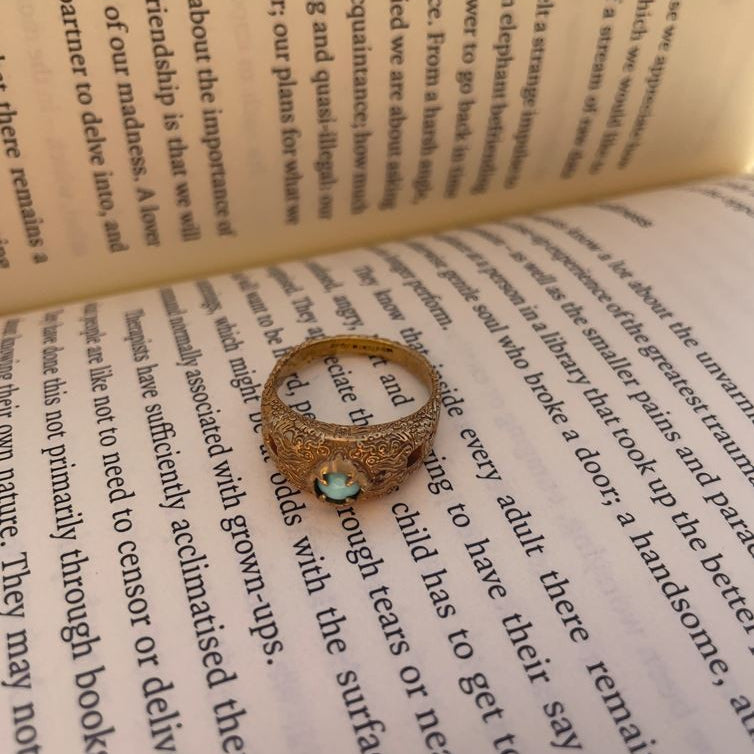 This ornately detailed ring features intricate carved patterns inspired by ancient Roman art, adding a touch of timeless elegance. At the center of the ring, a breathtaking large gemstone, carefully set in a bezel, captures the light and radiates a mesmerizing brilliance.