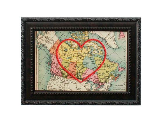 These vintage map prints have been hand embroidered with a heart for that special someone who loves Canada.