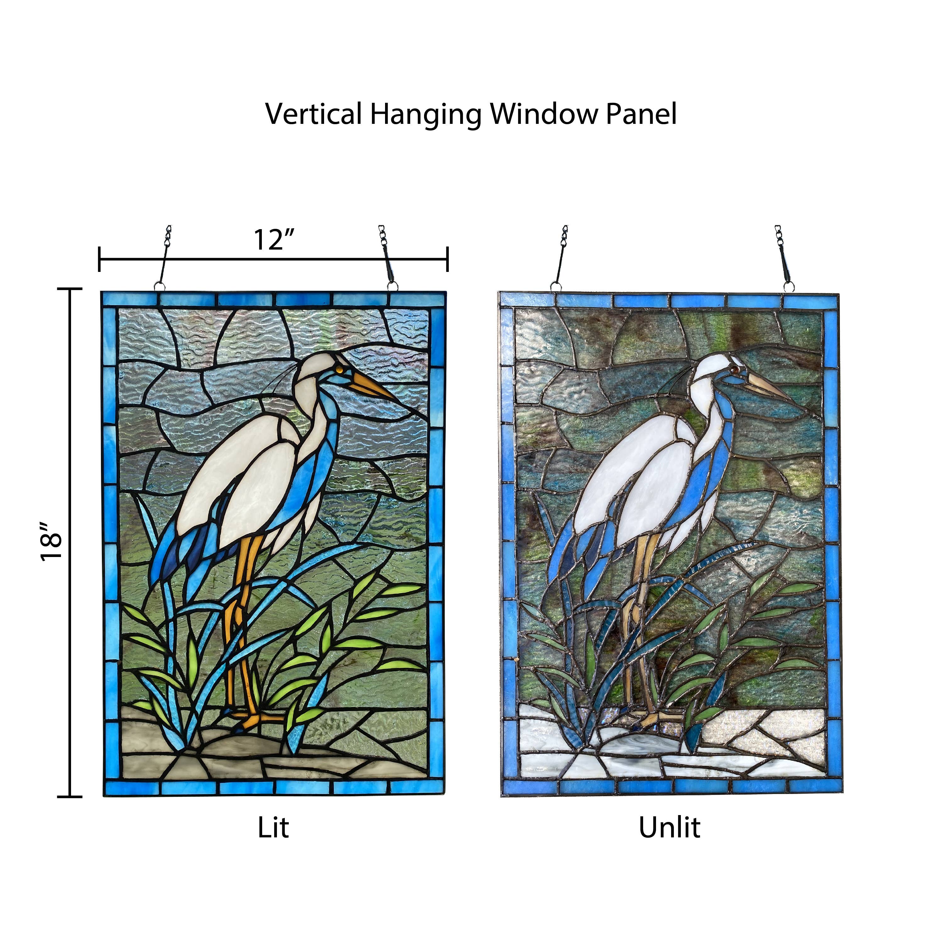 Featuring peaceful hues of Tiffany-style glass in blue, white and green, accented with hints of orange, this 18"H Majestic Crane Stained Glass Window Panel from River of Goods includes a single cabochon of orange Tiffany glass forming the crane's eye staring out into the middle distance from the shoreline. Handcrafted from 198 individual glass cuts, this 18"H stained glass suncatcher is created using artisanal iron soldering methods. A silver-colored metal link chain is attached for immediate hanging, whether in a sunny living room window or against an illuminated wall in a formal dining room for added drama. A true statement piece, this incredible stained glass artwork will be a family treasure for years to come. Overall Dimensions: 12"L x 0.25"W x 18"H
