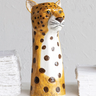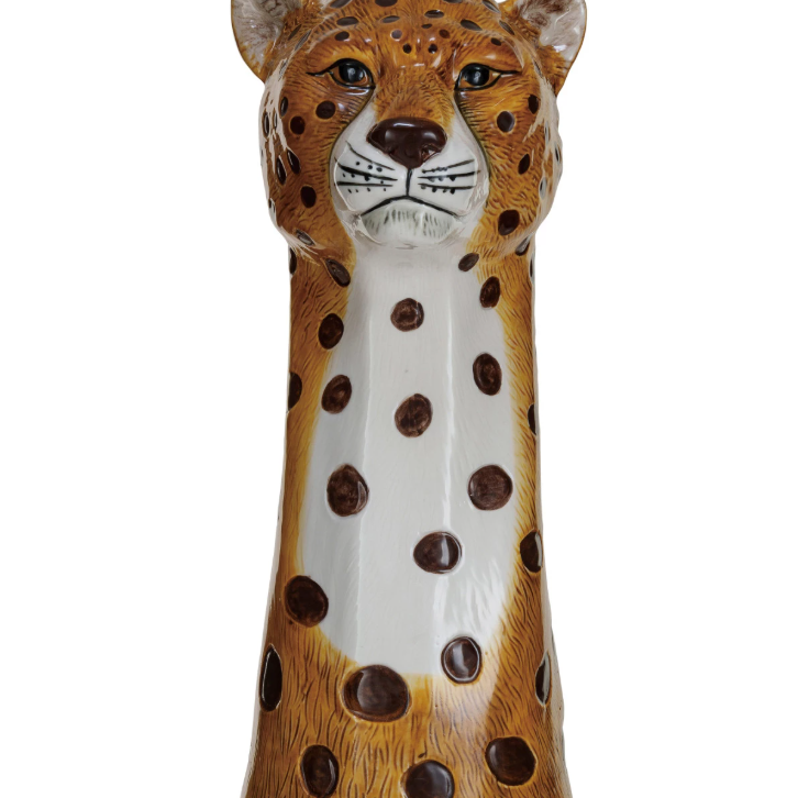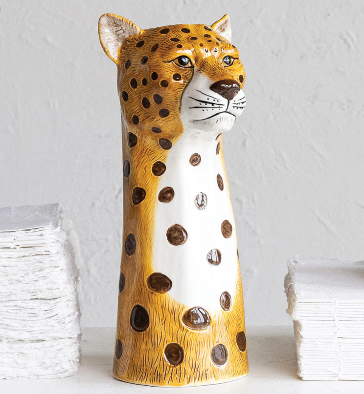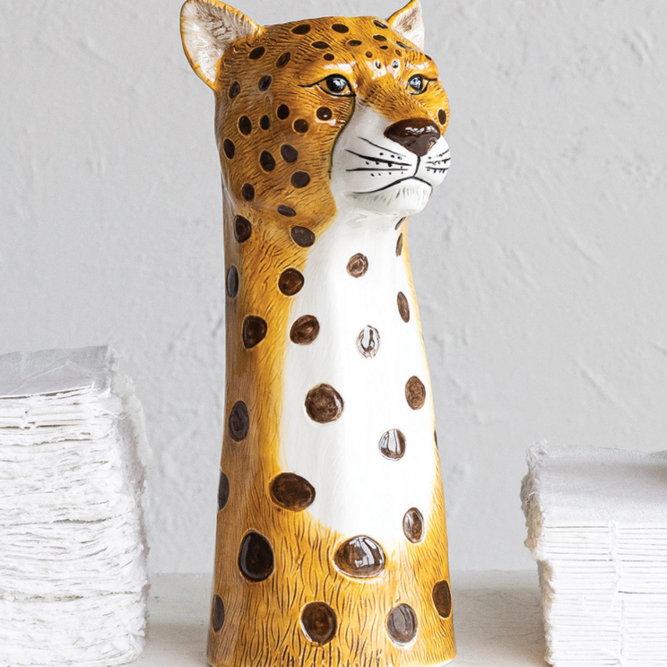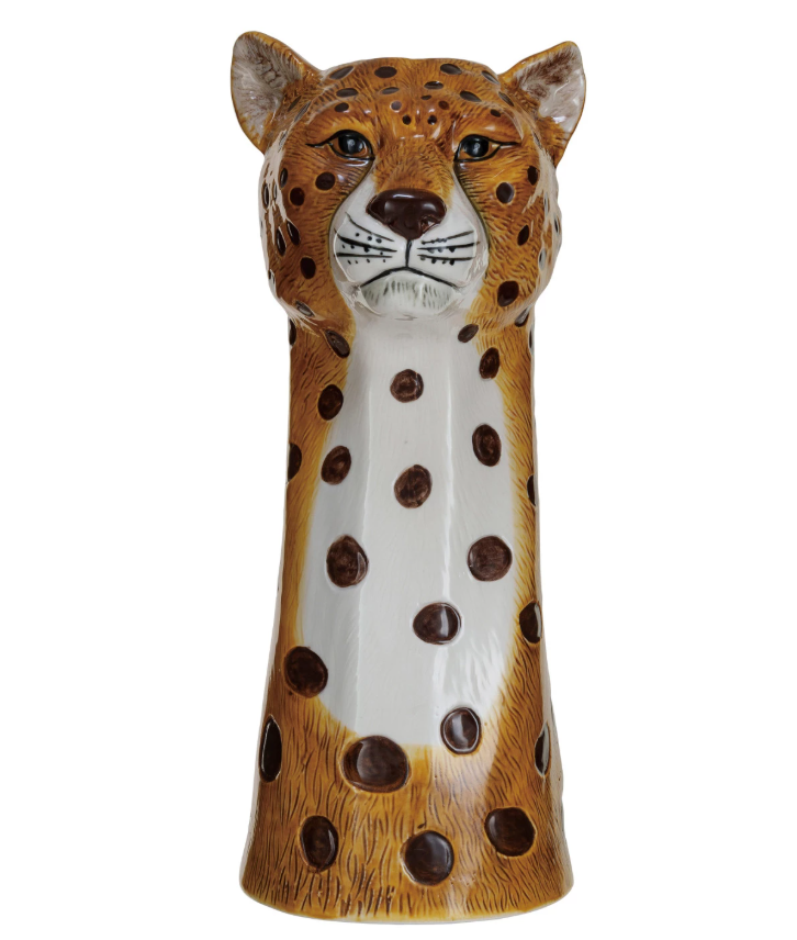 This round stoneware vase features a hand-painted cheetah design and a multi-colored scheme, giving it a wild and exotic look. Fired at high temperatures, the vase has a dense texture and a wide opening. The cheetah design is a striking and stylish addition to any home, whether it holds fresh or artificial flowers, plants, or branches. The vase can be placed in any room, from the living room to the bedroom, creating a fun and adventurous atmosphere.
