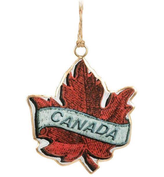 Show off your Canadian pride, even during the holidays, with this cool throwback Maple Leaf with Canada double-sided Ornament. Crafted out of metal, this ManMade ornament – Canadian artist Doug Jackson's line of products inspired by vintage maps, photographs and Canadiana – features a embroidered Maple Leaf patch accented with a "Canada" banner in grey. This double-sided ornament makes a patriotic, retro-chic addition to any proud Canada's Christmas tree. Other ManMade ornaments also available.