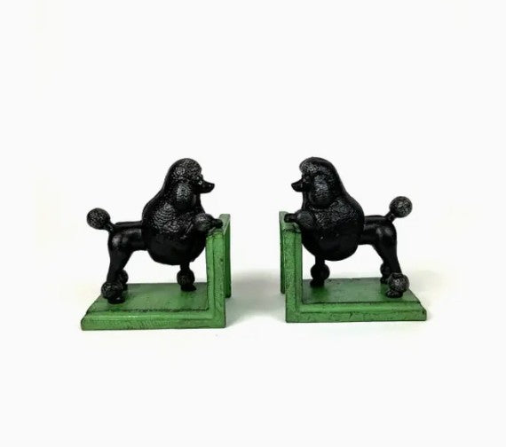 Add a touch of whimsy to any space with these charming Cast Iron Antiqued Black Poodle Bookends. These bookends feature a vintage-inspired design, perfect for dog lovers and vintage decor enthusiasts. Each pair measures 14.5x12.5x7.5 cm, offering a sturdy and stylish way to organize your books.