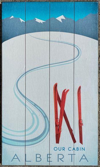 The wooden vintage style sign features a mountain landscape background with red skis standing in the snow as the foreground, along with a welcoming note "Our Cabin Alberta"
