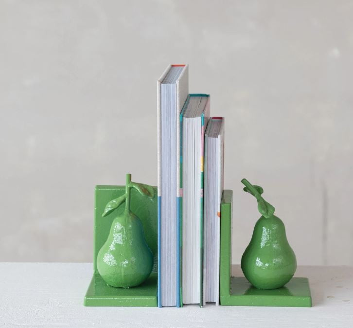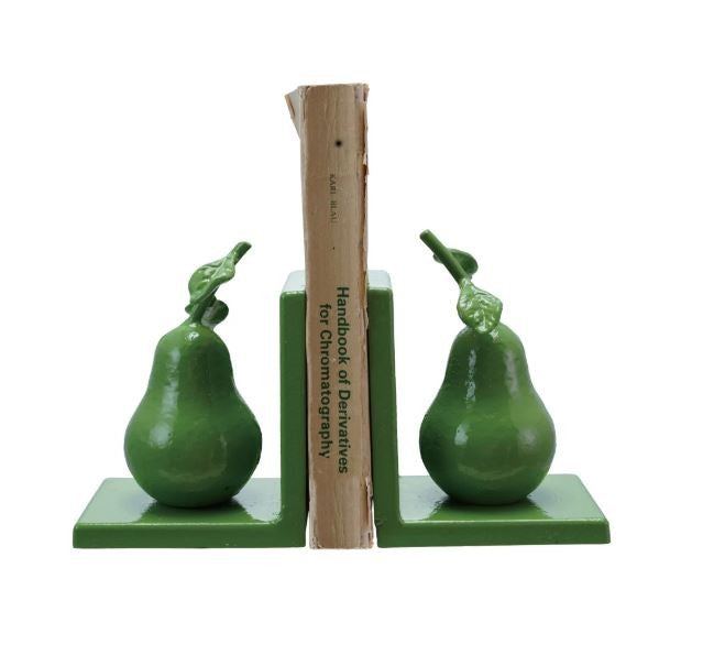 Add a fresh twist to your bookshelf with these sturdy cast iron pear bookends. Finished in a rich green hue, they bring a playful yet elegant touch to any space while keeping your books neatly in place.