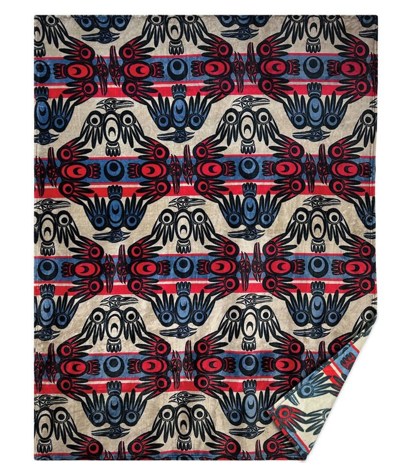 These luxurious blankets feature a plush velvety feel, and come individually packaged with ribbon and hang tag, perfect for home, ceremonies and gift-giving. Measuring a generous 60" x 80", and made large enough to fit a Queen size bed. Each blanket showcases one of the stunning full-colour Coast Salish designs, celebrating Indigenous artistry in bold, vibrant detail. Whether draped over your bed or wrapped around your shoulders, these blankets blend heritage, comfort, and style.
