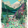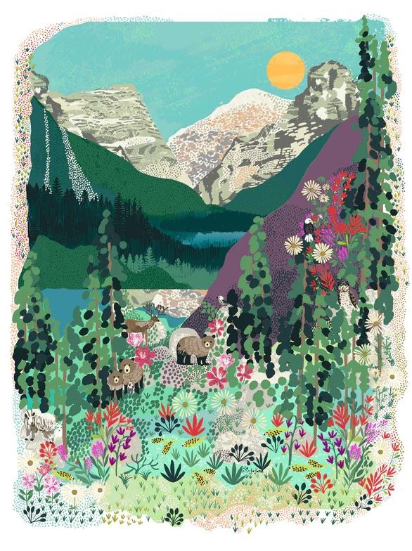 Banff is in the province of Alberta, located within Banff National Park. The peaks of Castle Mountain can be seen looming behind Elk, Grizzly Bears and Rainbow trout that swim in the turquoise glacier meltwater. Alpine flowers dot the foreground: Indian paintbrush, Oxeye Daisy and Lupins.
